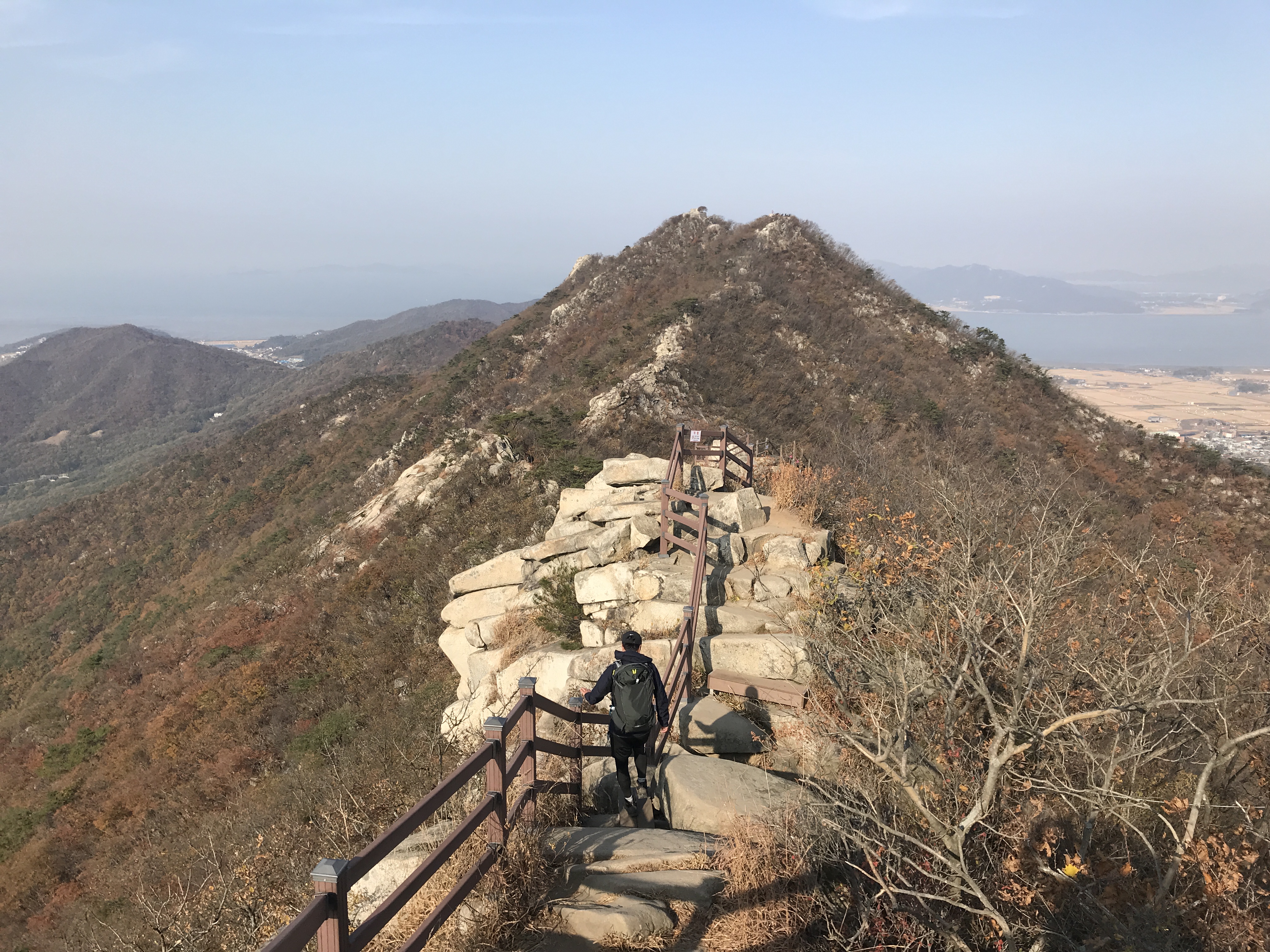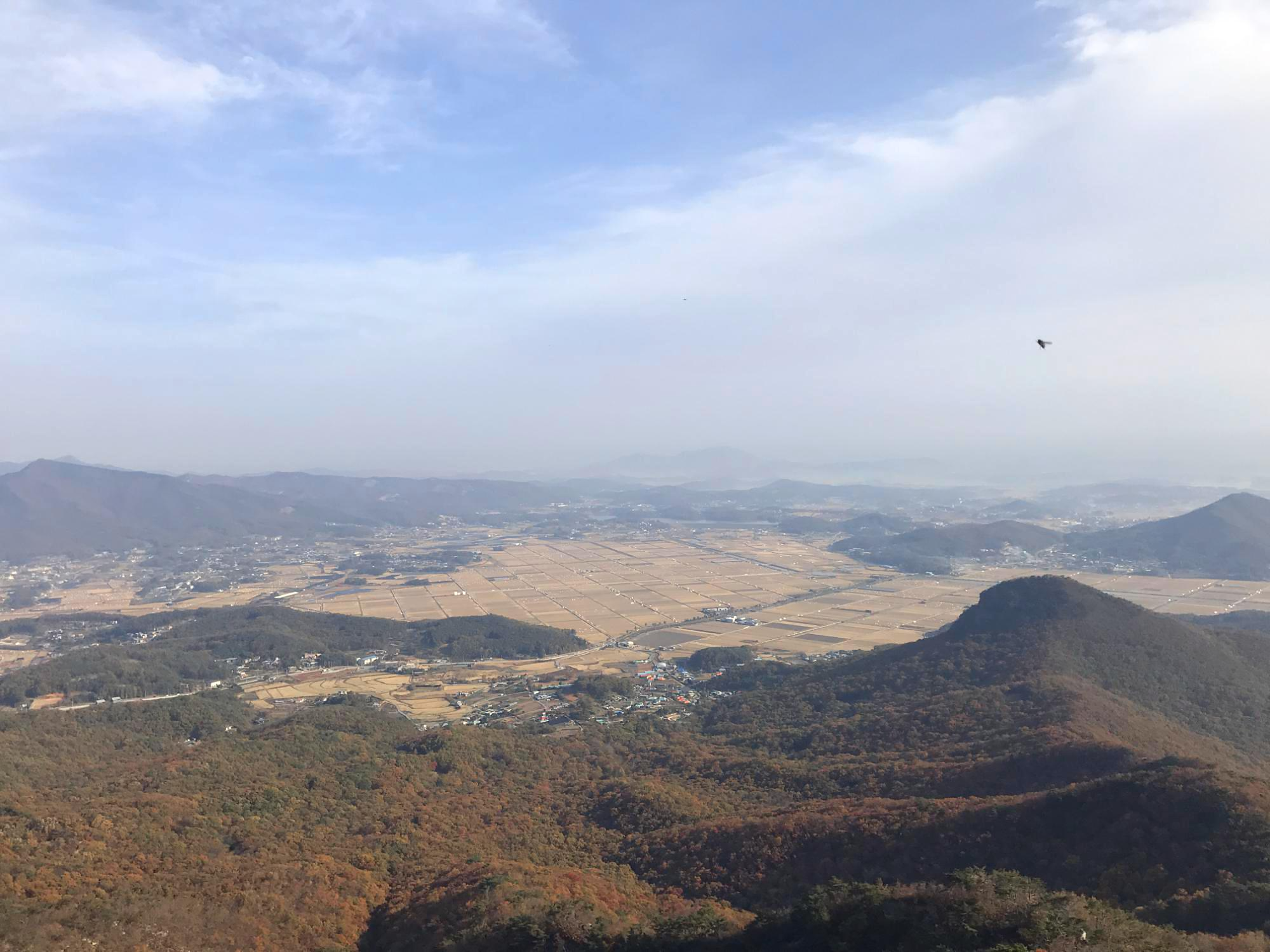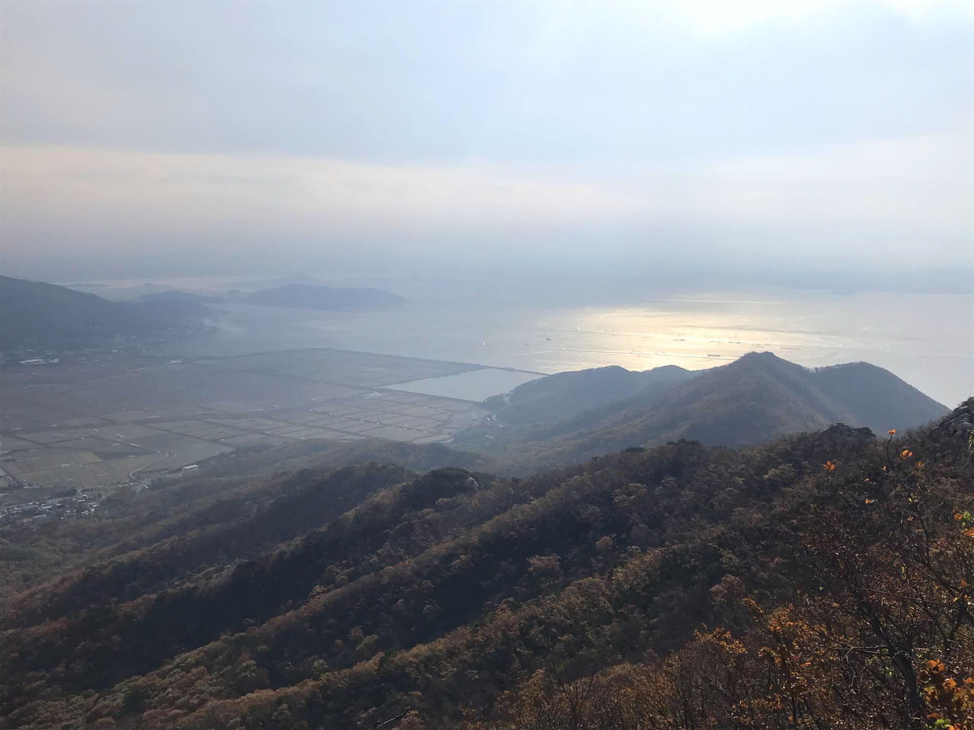 바위능선 길에 들어서니 동서남북으로 막힘없는 파노라마 뷰가 펼쳐집니다. 추수한 평야 그리고 간조로 인해 본 보습을 드러낸 갯벌의 풍경이 가히 장관입니다.