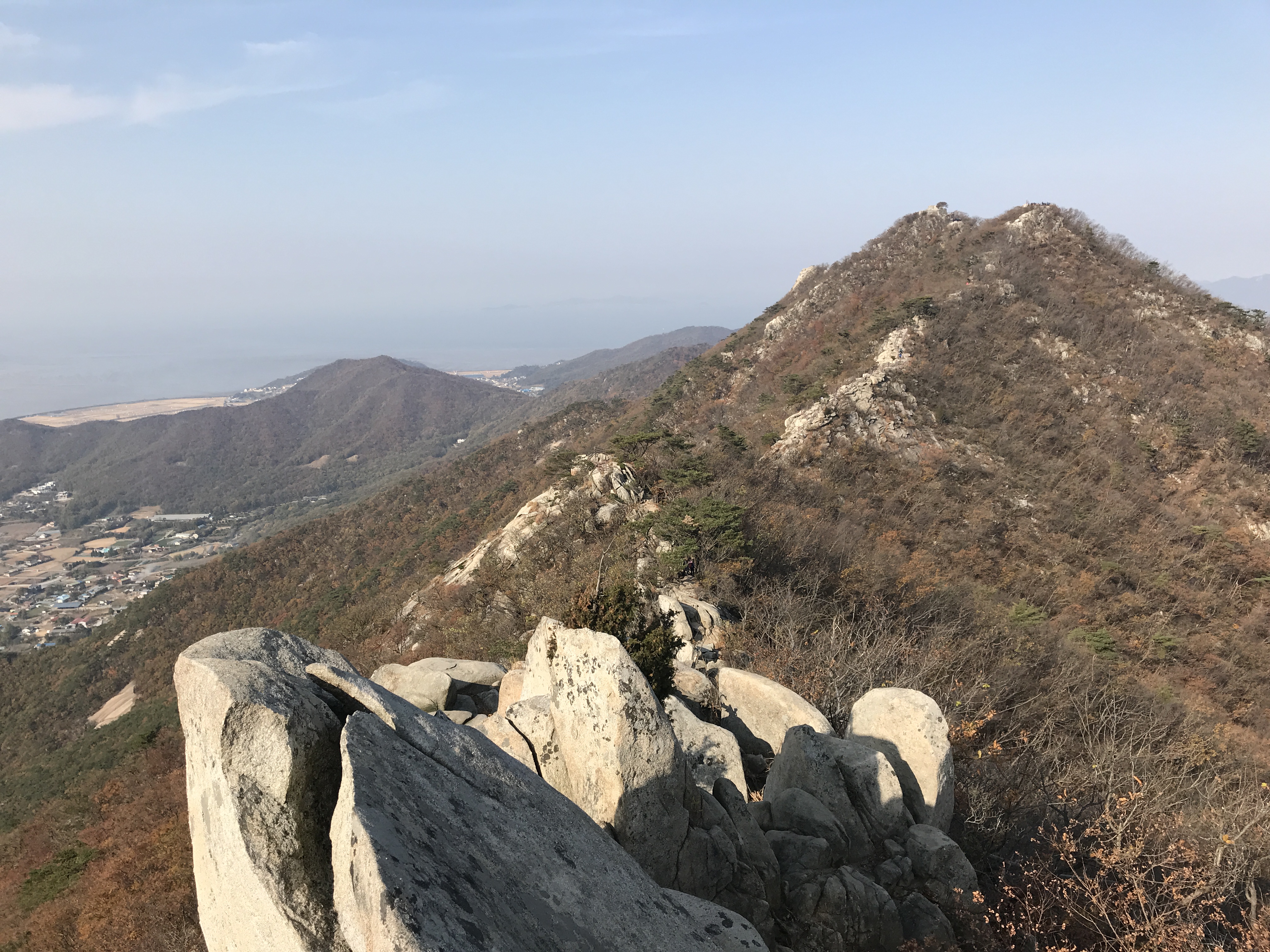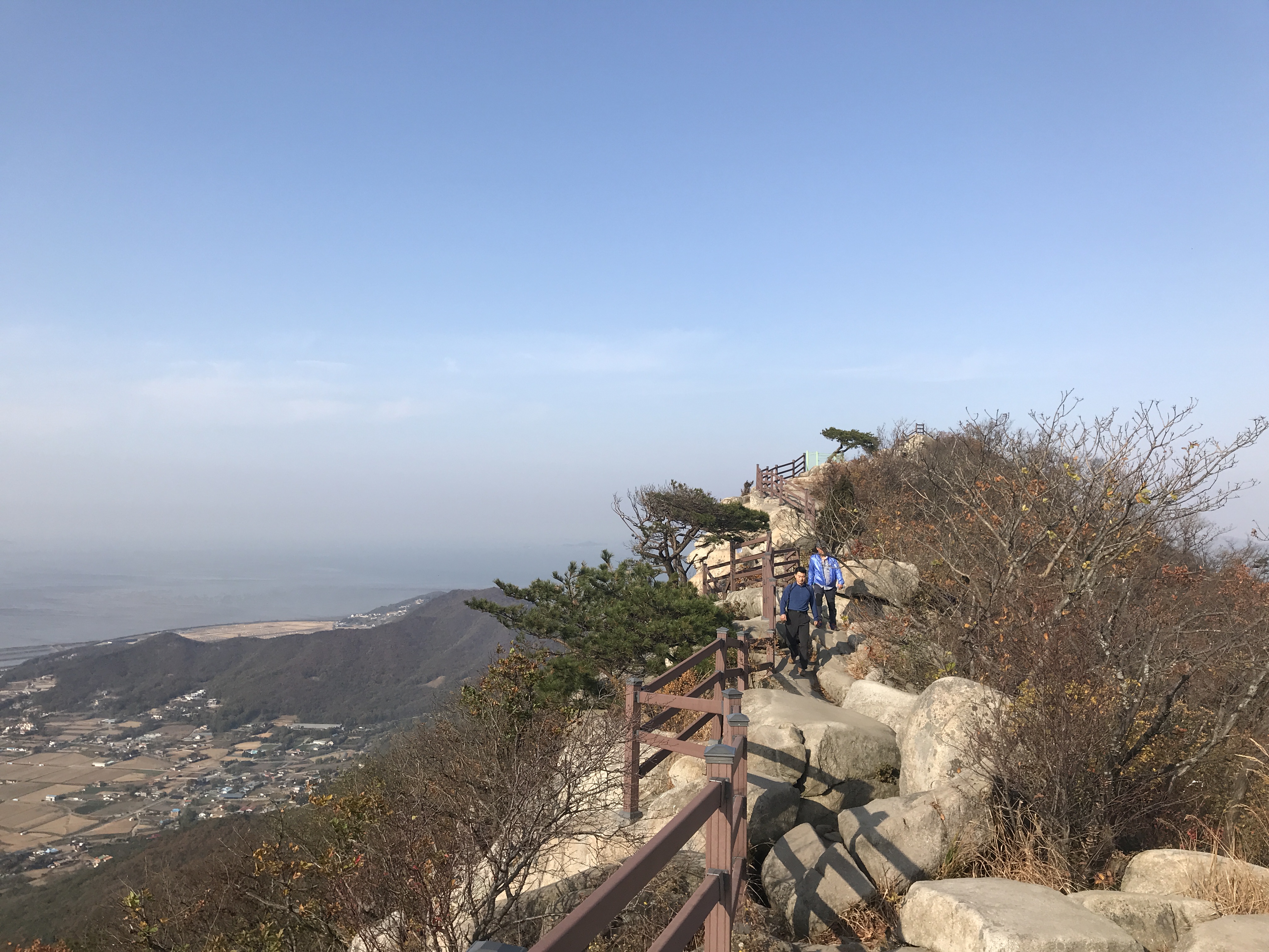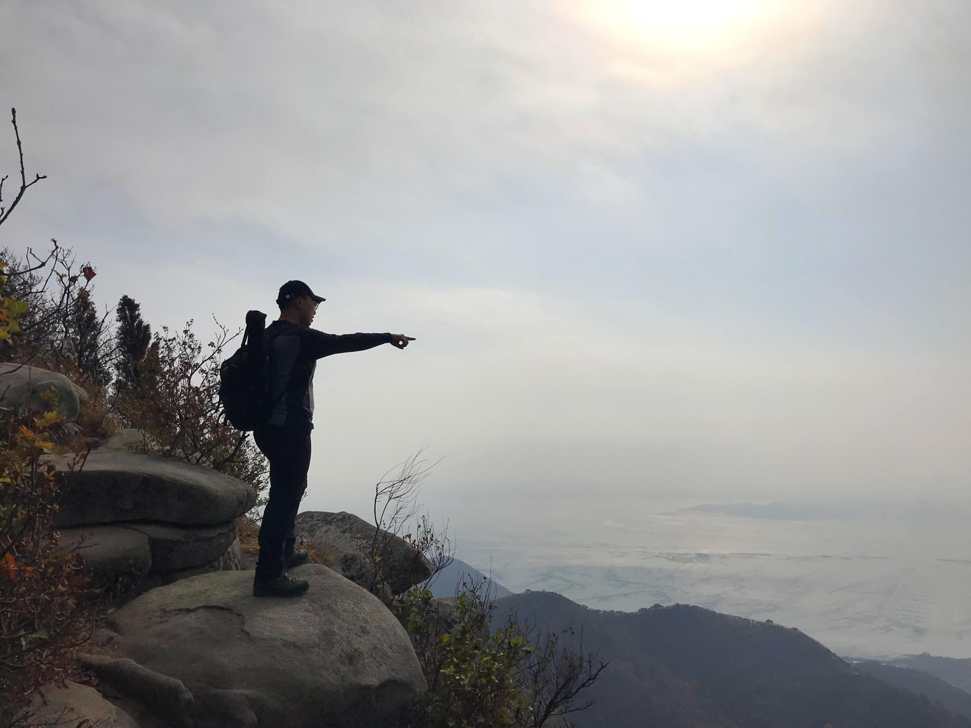 바위능선 길에 들어서니 동서남북으로 막힘없는 파노라마 뷰가 펼쳐집니다. 추수한 평야 그리고 간조로 인해 본 보습을 드러낸 갯벌의 풍경이 가히 장관입니다.
