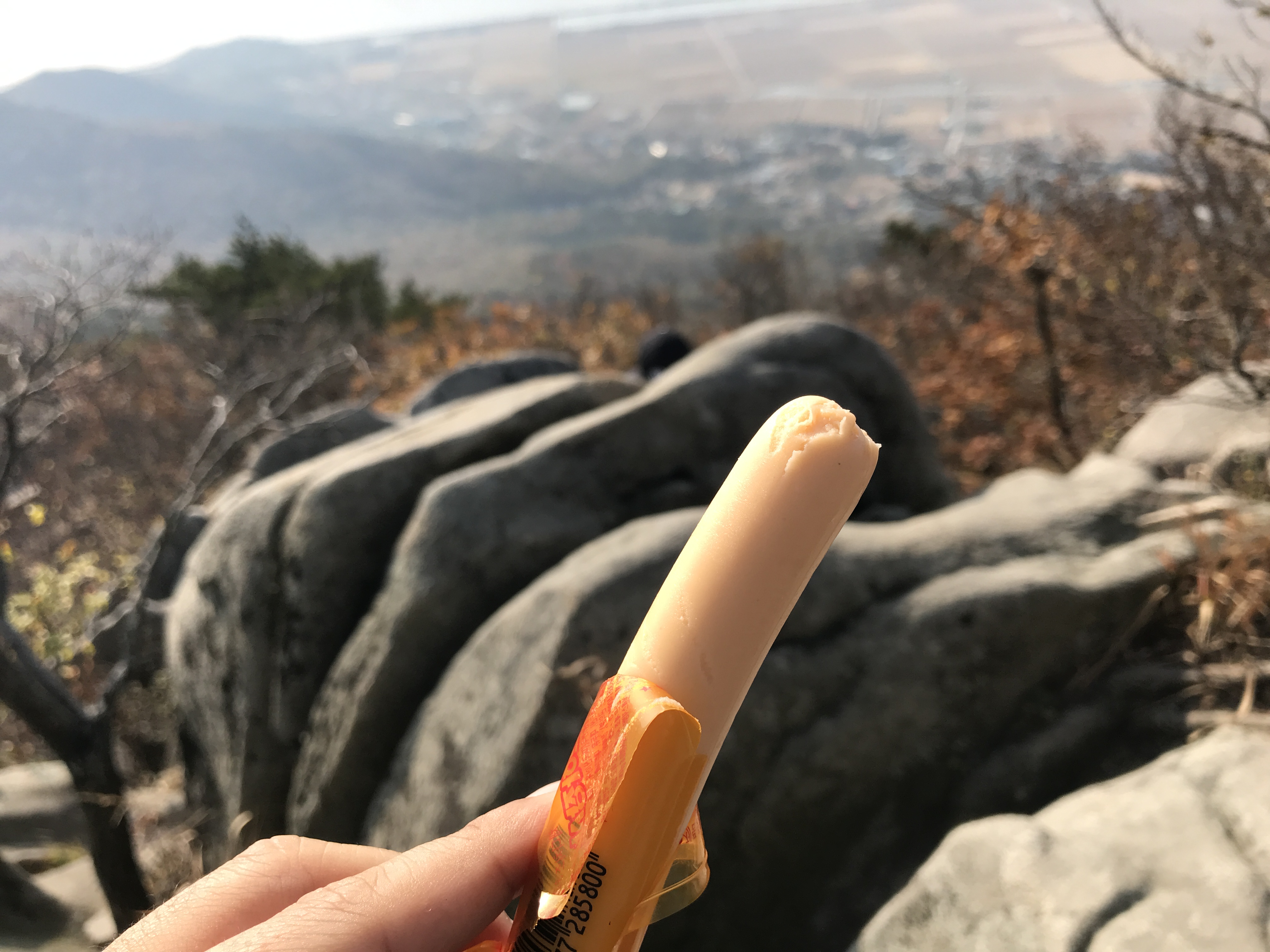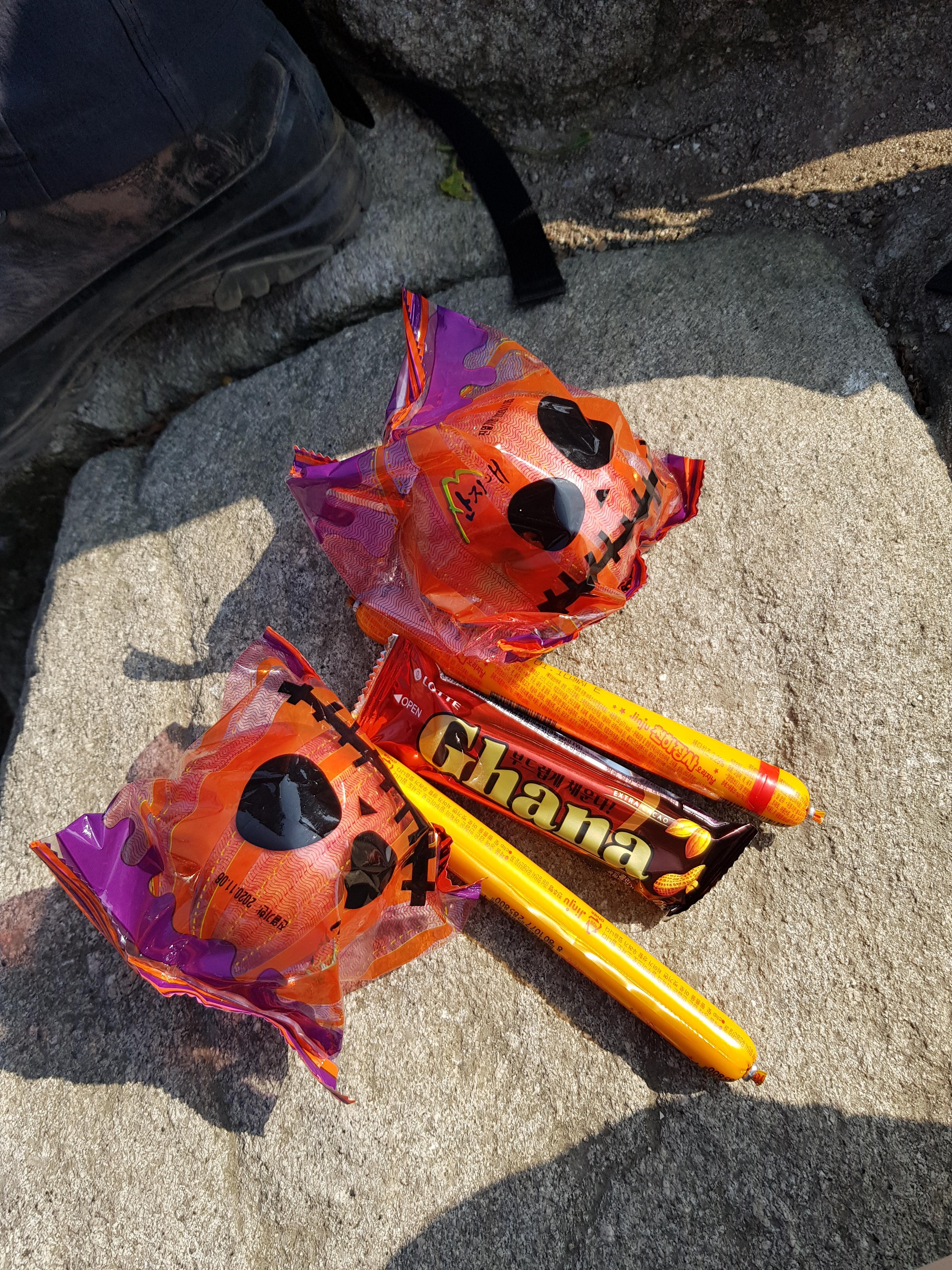 이번 마니산 산행의 간식들, 소시지 & 초콜릿 & 사과 각 2개 그리고 물 2리터. 아내랑 5시간 이내 산행할 때는 간단한 간식만 준비해서 가는 편입니다. 가볍고 좋더라고요.